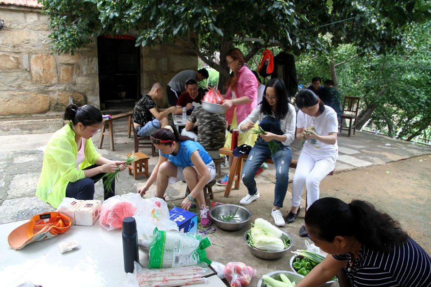 这处清幽洁净的农家小院成了队员大展厨艺的用武之地,大家迅速整理好自带的蔬菜食物,按各自特长分好工。有清理蔬菜的、有和面的、有刷锅烧水的,那些实在帮不上忙的便凑到一起围坐在院中的树荫下开始“掼蛋”比赛。厨房中,面对农户家中的那两口大草锅,负责炒菜的队员直挠头,因为在城里实在是无处寻觅这样的锅灶了,更不知该如何才能把这灶火烧得旺旺的。这时我们的女队员刘惠自告奋勇,勇敢地担起了“伙头军”的重任。还别说,在经过户主老大爷的一番指点后,一会儿功夫这灶火便被她烧得有规有距起来。很快,灶房便飘出了炒肉、煎蛋的香味。此时,院中也已摆起了包旱饺的阵式来了。面已和好,两种口味的馅料也已备好。有负责擀饺子皮的,有负责包饺子的,队员们赛速度、赛质量,两种口味的饺子被分别摆放在各自的簸箕里。看着形态各异的饺子,大家忍不住评价起来,最终有队员被冠上了“专业面点师”的雅号。人多力量大,当所有的菜肴、面点摆到长桌上时,大家开心不已,虽然这算不上美味佳肴,但自己的劳动果实却总是最美味。