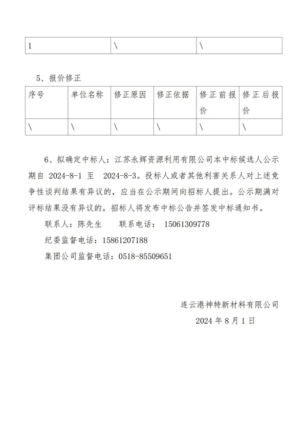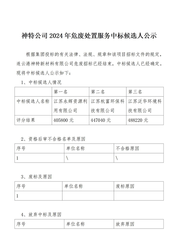 神特公司2024年危废处置服务中标候选人公示